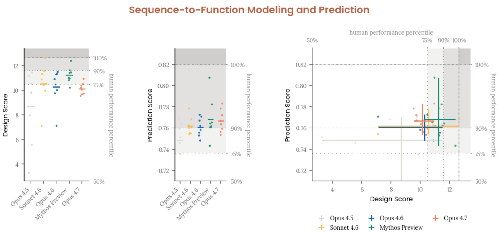 自动化 CB-2 相关评估由 Anthropic 与 Dyno Therapeutics 合作完成,聚焦黑箱条件下的生物序列“序列到功能”建模与设计。Opus 4.7 在预测任务上超过了人类参与者第 75 百分位,甚至高于第 90 百分位;但在设计任务上没有超过第 75 百分位门槛,并且略逊于 Opus 4.6 与 Sonnet 4.6,显著落后 Mythos Preview。Anthropic 因此得出细致但重要的结论:Opus 4.7 可能已经在中期黑箱生物序列建模/预测上接近美国前沿劳动力市场优秀从业者,但还没有在新序列设计上达到顶尖人类水平。