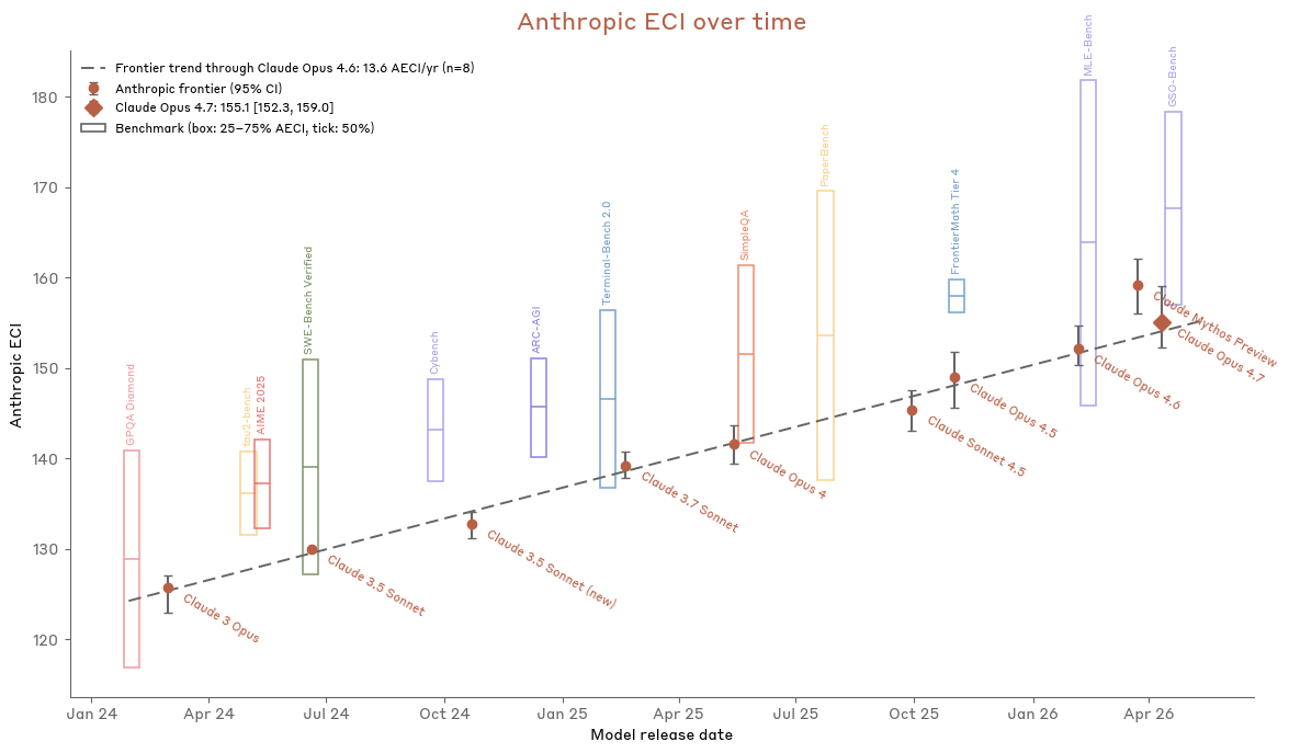 支持这一判断的理由有两条。第一,Anthropic 没有观察到与“AI 驱动研发飞轮”相匹配的持续 2 倍级能力加速。Anthropic 自己的 AECI(Anthropic Epoch Capability Index)拟合显示:如果只用 Claude Opus 4.6 之前的前沿模型画线,Opus 4.7 只比这条历史趋势线高出大约 +1.0 AECI,仍在误差条范围内;而 Mythos Preview 则高出约 +5.8 AECI。第二,Anthropic 在日常内部使用中并未感到 Opus 4.7 接近“即插即用替代研究员”,尤其远不到能替代资深研究科学家和工程师的程度。