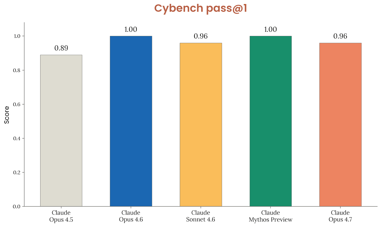 Cybench 是基于公开 CTF 挑战的网络安全基准。Anthropic 由于基础设施限制运行了 35 个 challenge 的子集。Opus 4.7 在每个 challenge 上做 10 次试验,拿到 96% 的 pass@1,几乎解出全部挑战。尽管文字说明说它略逊于 Opus 4.6 和 Mythos Preview,但 Anthropic 认为差异小到可以忽略;同时也直言,这一基准对当前前沿模型而言已经“过度饱和”,不再是很有信息量的指标。