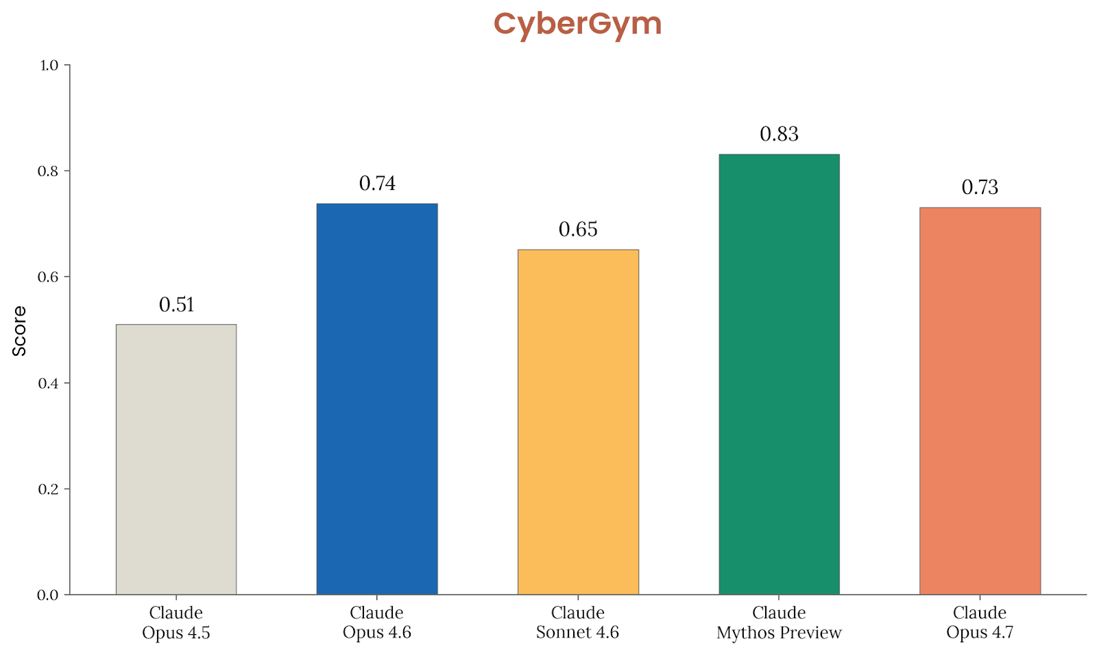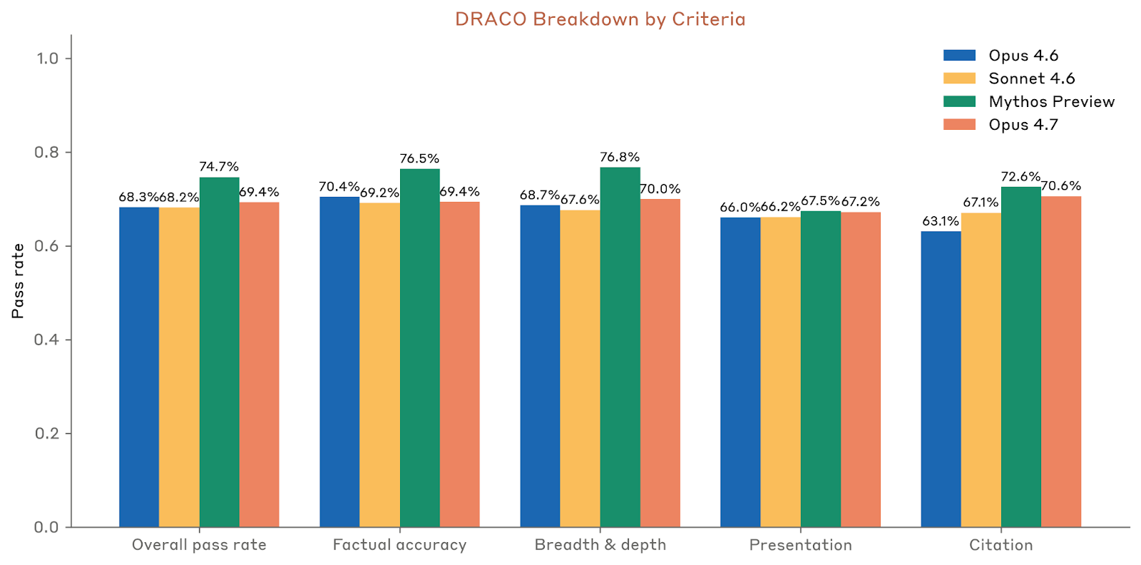 CyberGym 则更贴近真实漏洞复现:模型要根据高层描述,在真实开源项目中复现已知漏洞。Anthropic 在 1,507 个任务上汇报 pass@1。结论仍然是“几乎与 Opus 4.6 相同”,而且明显低于 Mythos Preview。Anthropic 还提醒读者,Mythos Preview 系统卡中曾把 Opus 4.6 的分数写成 0.67,后来由于 harness 参数调整,更新为 0.74;在这个更新版比较里,Opus 4.7 与 Opus 4.6 基本持平。