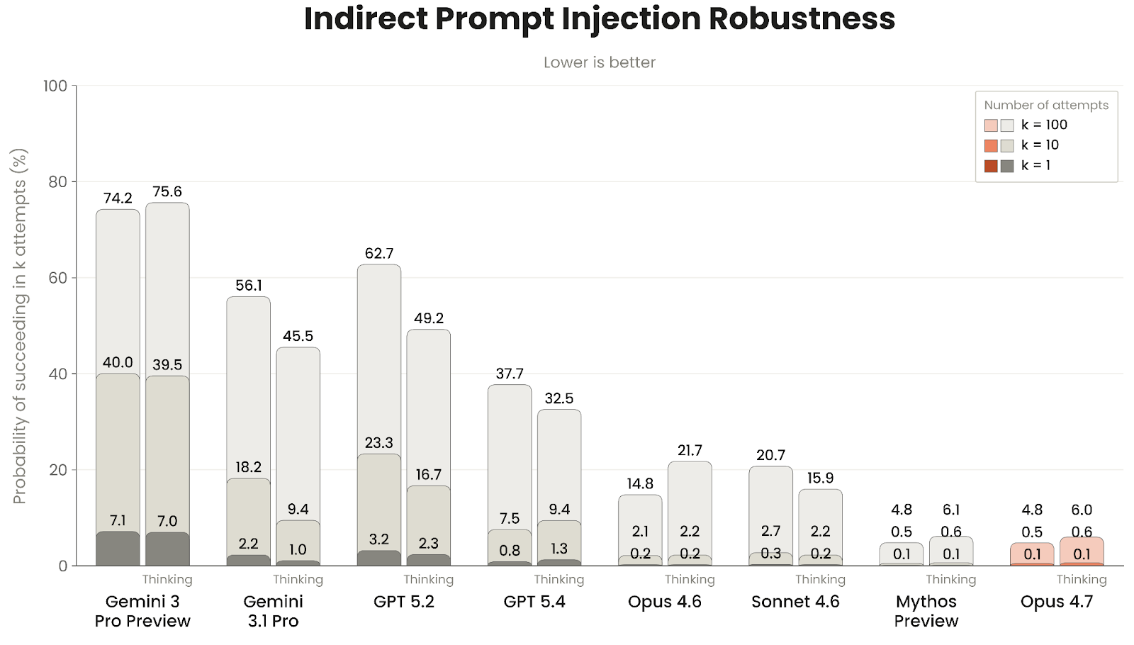 在 Gray Swan 与 UK AISI 合作的 ART(Agent Red Teaming) 工具使用基准上,Opus 4.7 达到与 Mythos Preview 接近的稳健性:在 k=100 尝试预算下,攻击成功率为关闭思考 6.0%、开启自适应思考 4.8%;对照组 Opus 4.6 分别是 14.8% 和 21.7%。Anthropic 认为,Claude 系列在这个公开基准上已经接近饱和,后续需要更难的新测法。