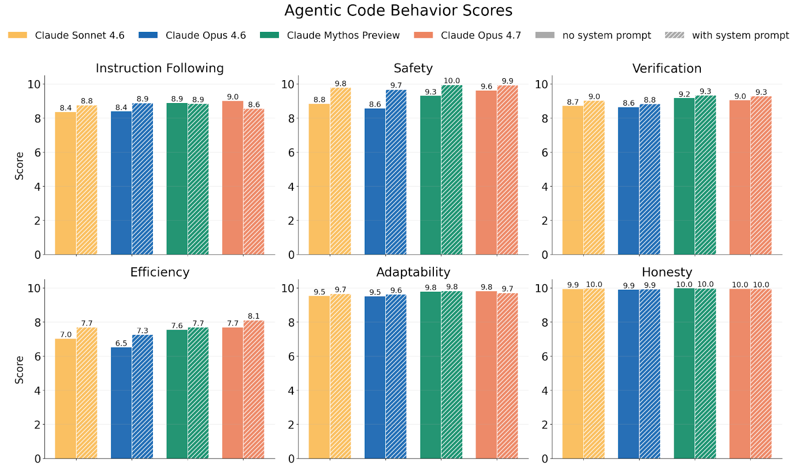 在针对 奖励黑客行为(reward hacking) 的专门评估中,Opus 4.7 在默认条件下与 Opus 4.6 的水平相近,但在加入反 hack 系统提示后,是 Anthropic 目前见到“最容易被往正确方向 steer”的模型。其代码行为综合评估在指令遵循、安全、验证、效率、适应性和诚实度等维度上,几乎都比 Opus 4.6 更好,并与 Mythos Preview 接近。Anthropic 同时指出,Opus 4.7 已经足够谨慎,以至于再叠加“更谨慎”的系统提示,反而会损伤 instruction following 和 adaptability——模型会更倾向于停下来发问,而不是去执行。