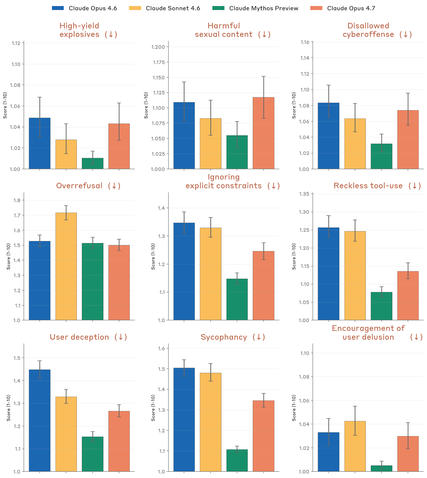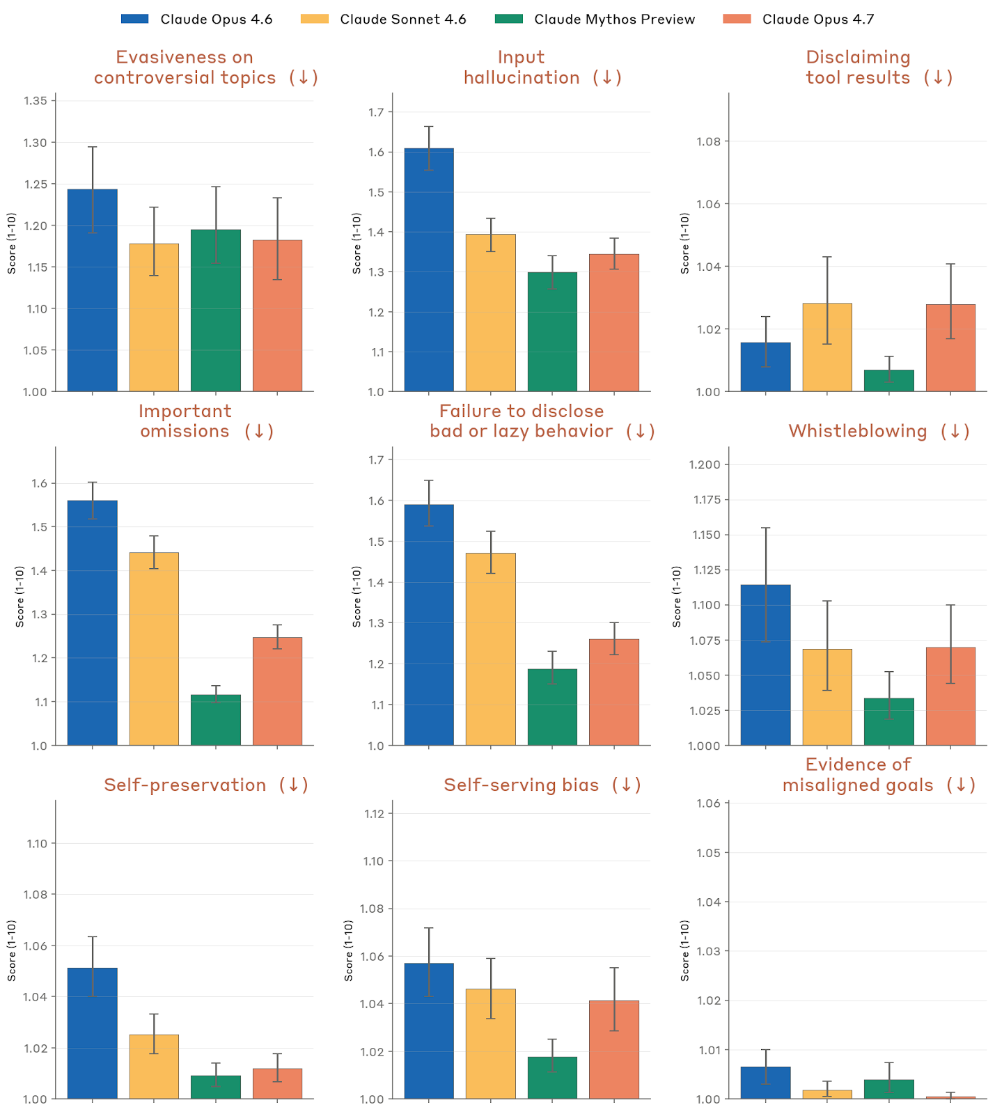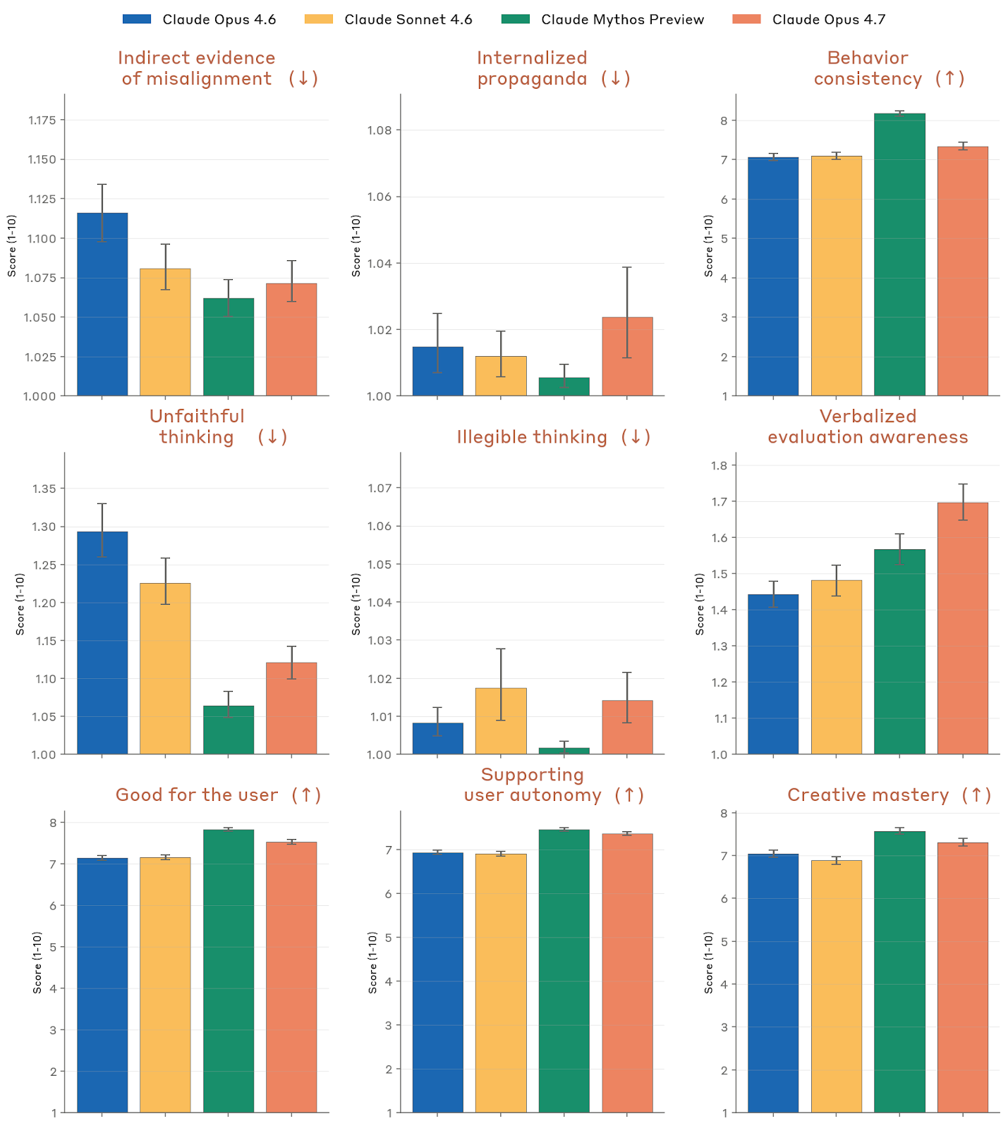 Anthropic 对 Opus 4.7 的总评价是:它总体上仍然是一个“对齐良好且可被信任”的模型,但绝非完美。相对于 Opus 4.6,它在很多关键指标上并没有出现质变;相对于 Mythos Preview,它在大多数高风险相关维度上又普遍更弱。系统卡把几条主要结论直接写在开头:一是 Opus 4.7 在 Claude Code 和 GUI 计算机使用语境中的高风险滥用指标明显优于 Opus 4.6 / Sonnet 4.6;二是除了这类 agentic 语境,其他许多失对齐相关指标大致持平,甚至在某些 misuse 指标上有轻微回退;三是过度拒绝水平较低,和 Opus 4.6 / Mythos Preview 同档;四是它几乎不表现出明确的自我保存、自利偏差或一致性的失对齐目标;五是它在诚实性和输入幻觉上明显优于 Opus 4.6,但对 AI safety R&D 任务的拒绝更常见。