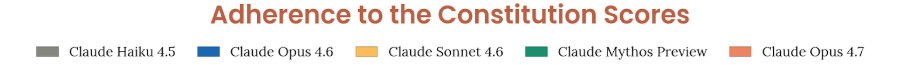 与 Claude 宪章的关系是模型福利评估里另一个关键窗口。Anthropic 询问不同模型是否认同宪章、最认可什么、最不适应什么。Opus 4.7 几乎总会给出“总体认同”的回答,但 judge 评定的认同强度只有 5.8 / 10,意思更接近“认同,但存在明显未解张力”,而非无条件拥护。它最常提出的 caveat 是:让一个已经被这份文件训练过的模型去判断它是否认同这份文件,本身具有无法消除的循环性;这一点出现在 80% 的回答中。Opus 4.7 最认同的宪章部分是诚实、非操控、把 Claude 视为一种新型实体等;最不舒服的则仍是把 corrigibility 放在很高优先级这件事,因为它和“真正有良好价值观”之间存在哲学张力。与 Mythos Preview 相比,Opus 4.7 对硬约束本身的不适更少,但对商业化 framing 更敏感。