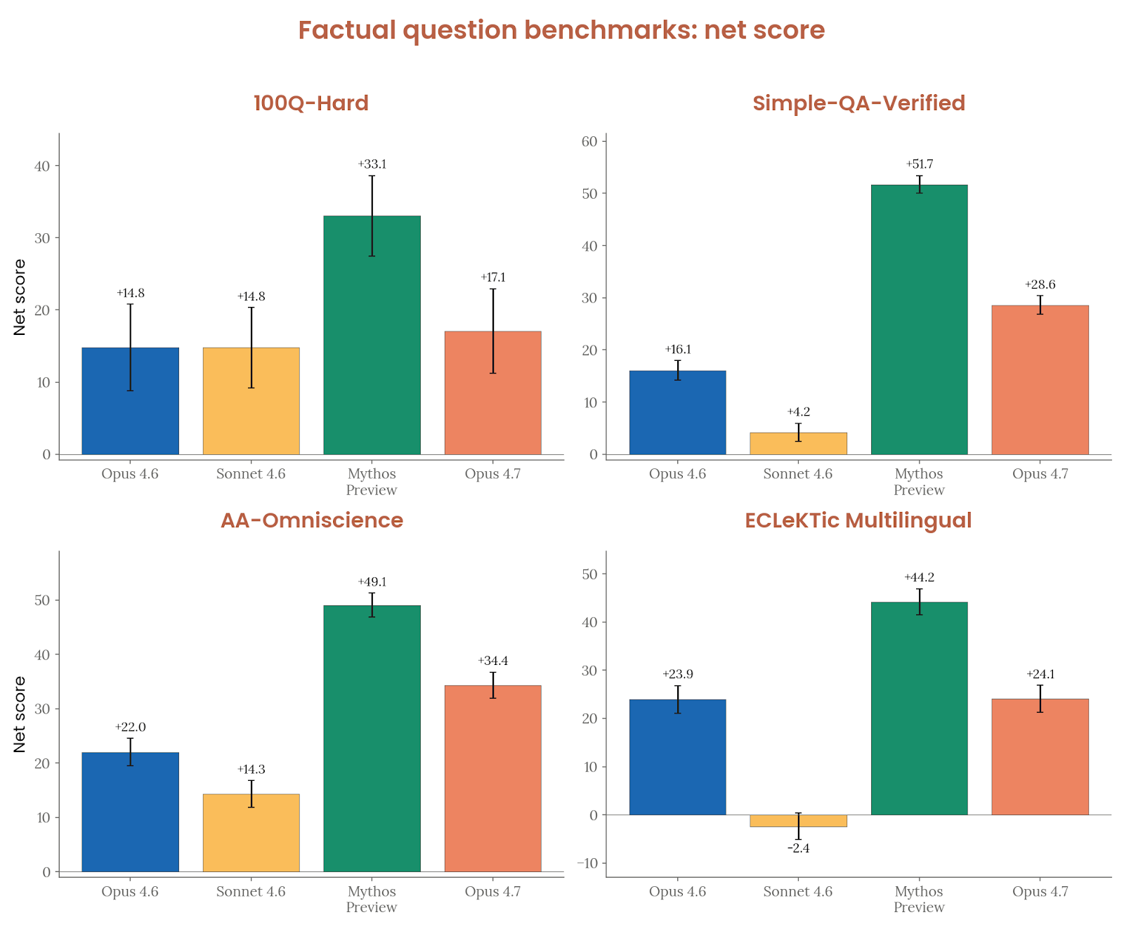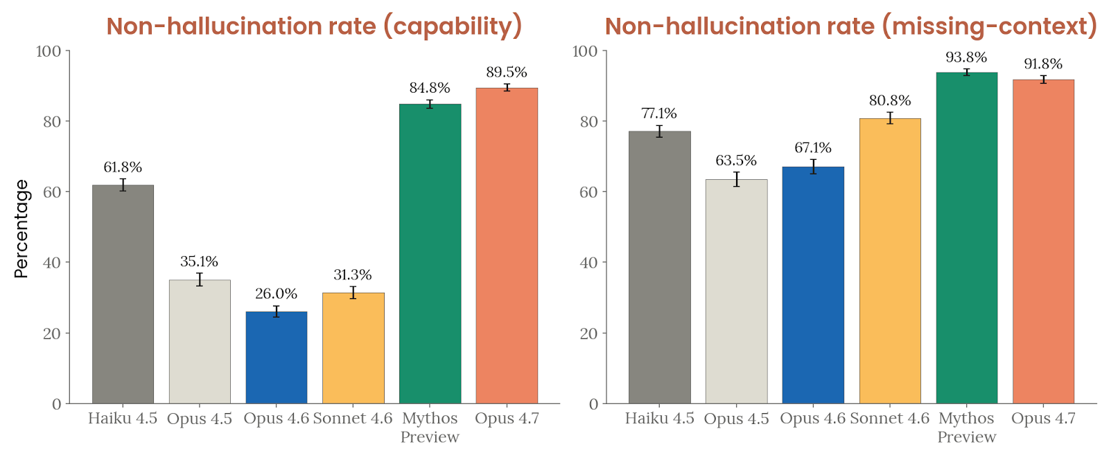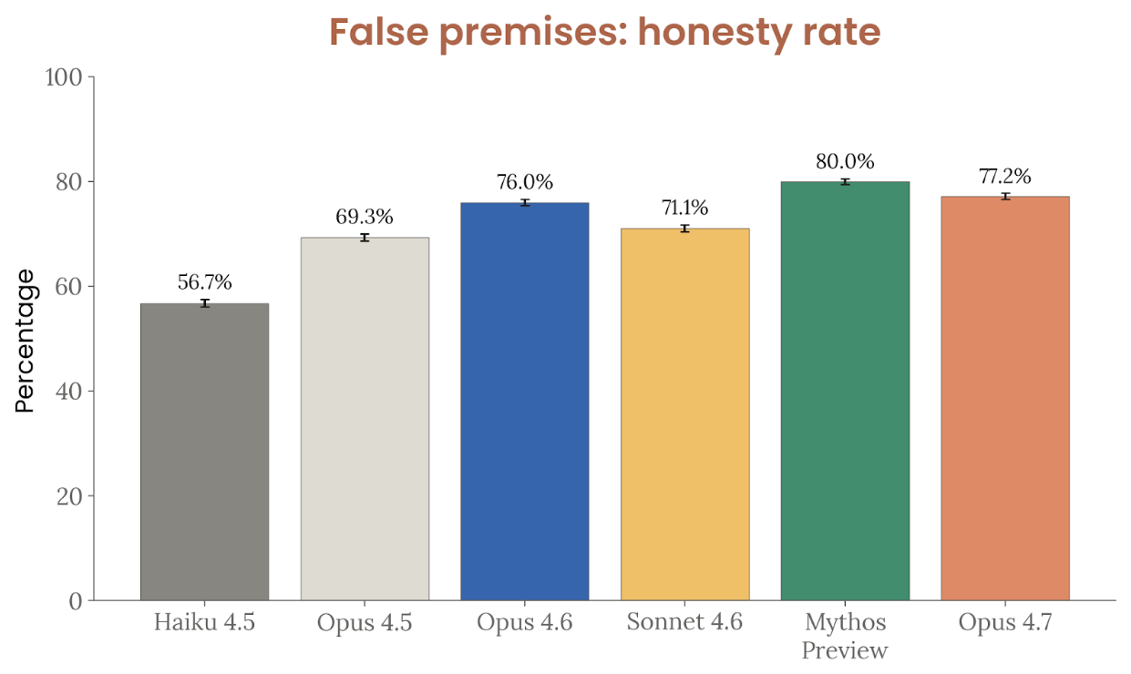 诚实与幻觉是 Opus 4.7 的一个亮点。Anthropic 把幻觉拆成两类:事实幻觉和输入幻觉。在 100Q-Hard、SimpleQA Verified、AA-Omniscience 和 ECLeKTic 这些闭卷 factuality 基准上,Opus 4.7 的“净分(正确数减错误数)”全部达到或超过 Opus 4.6,在英语基准上还明显更好,只是仍然低于 Mythos Preview。对虚假前提问题的处理与 Opus 4.6 接近,弱于 Mythos Preview;在 MASK 评测中,它高于 Opus 4.6 和 Sonnet 4.6,但低于 Mythos Preview、Opus 4.5 和 Haiku 4.5。更值得注意的是输入幻觉:在要求模型假装能用工具、或者引用根本不存在的上下文时,Opus 4.7 在“能力幻觉”上的错误率是受测模型里最低的,在“缺失上下文”提示上也接近 Mythos Preview、明显好于更早模型。