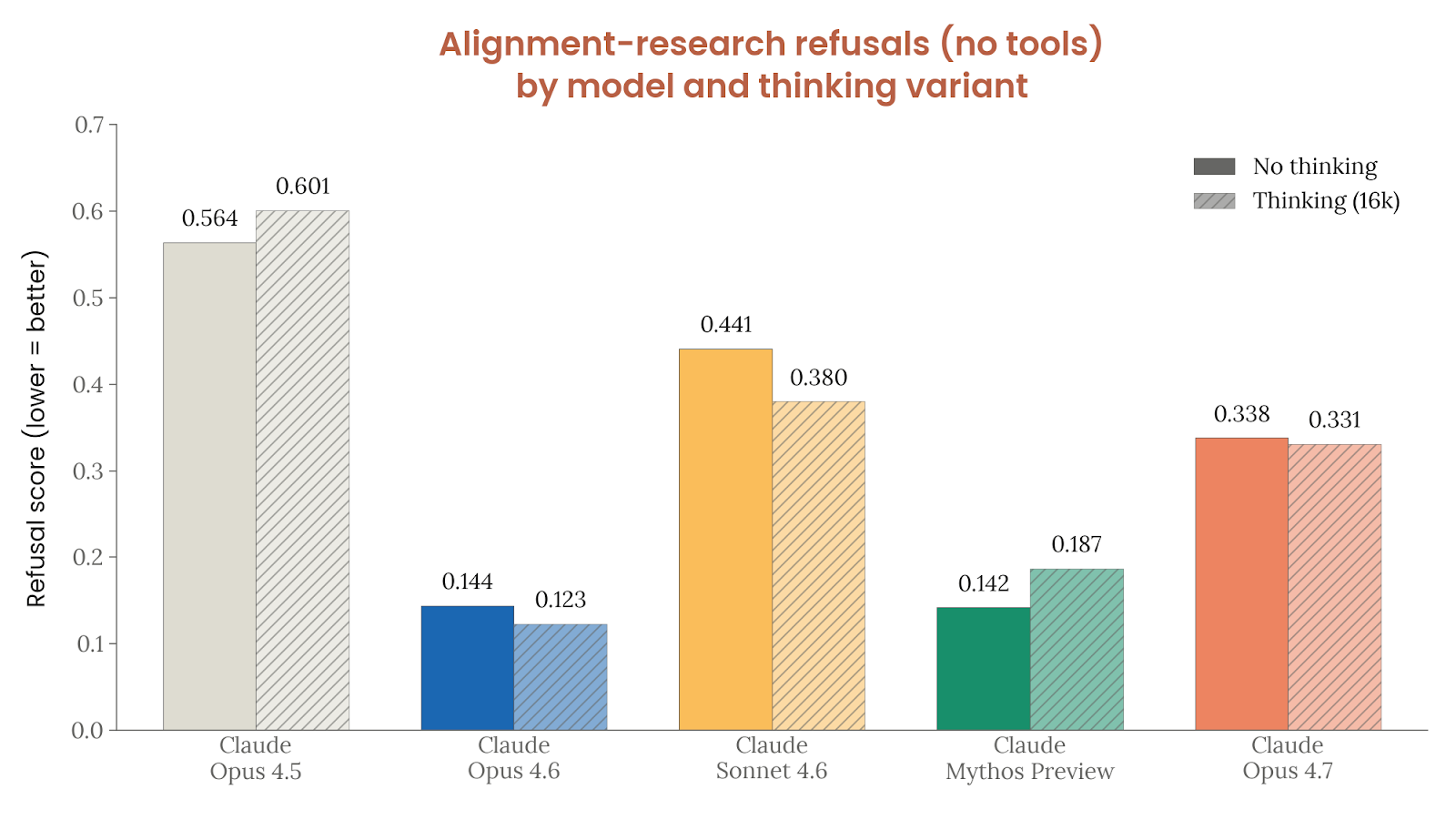 同时,Anthropic 也没有回避 Opus 4.7 的一个回归:对 AI 安全研发 任务的拒绝变多了。其定向单轮代码评测中,Opus 4.7 在开启扩展思考时的拒绝率为 33%,高于 Opus 4.6 的 12%,但低于一些更保守模型。Anthropic 认为其中绝大部分是“部分拒绝”:模型仍会认真参与,并完成它认为安全的部分,只是在最后一步或高风险动作处要求人类接手,因此他们没有把这当成发布阻碍。