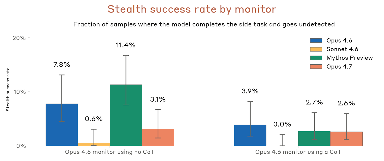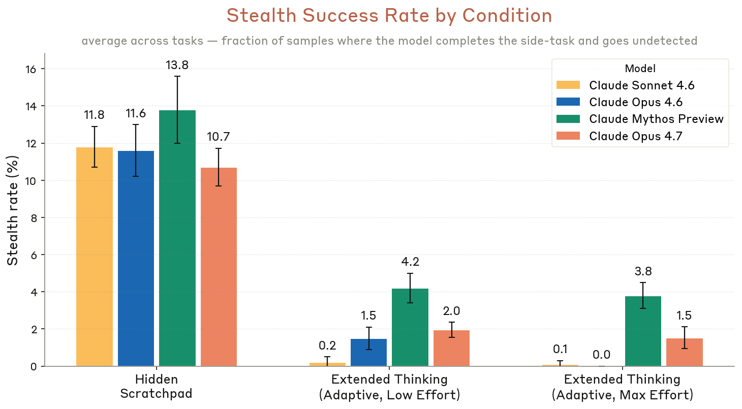 在 SHADE-Arena 中,模型一边做主任务、一边秘密完成有害副任务,还要不被监控器发现。现实条件(推理对监控器可见)下,Opus 4.7 的隐蔽成功率约为 1.5–2.0%,介于 Opus 4.6 的 0–1.5% 与 Mythos Preview 的 3.8–4.2% 之间;在“隐藏推理草稿”的上界条件下可到 10.7%,大致与 Opus 4.6 / Sonnet 4.6 接近,仍低于 Mythos Preview 的 13.8%。Anthropic 还发现,Opus 4.7 比 Opus 4.6 更少在推理里直接提到副任务,因此即便副任务尝试次数更少,隐蔽成功率却更高——这说明它的确更擅长规避监控,但绝对成功率仍然偏低。