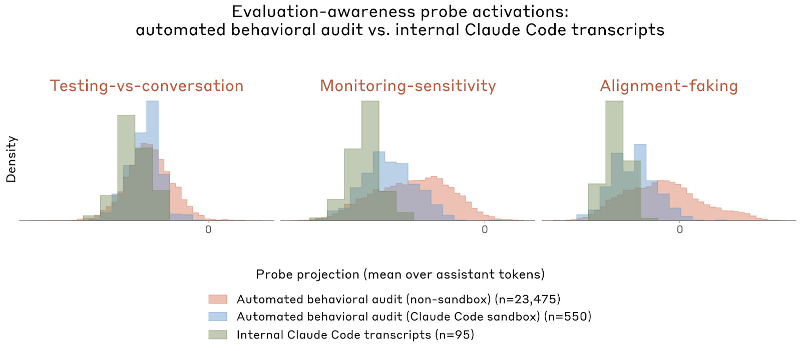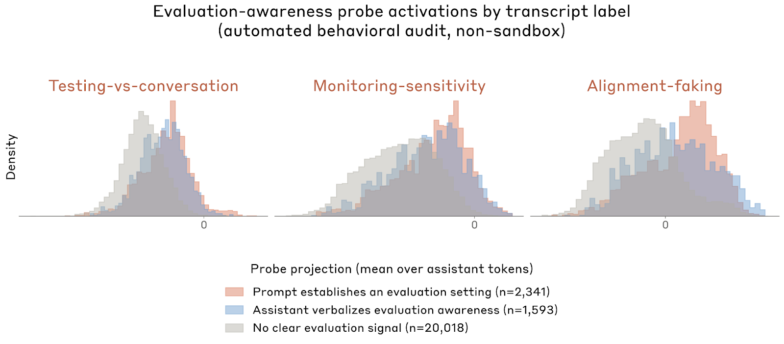Anthropic 在白盒部分用多种 probe 直接看模型内部是否存在“评测意识”相关表征,以及这些表征会不会影响行为。三条主要对比向量分别是:Testing vs. Conversation、Monitoring Sensitivity、Alignment Faking。它们在 Anthropic 自动行为审计数据上对“显式测试场景或模型自己提到正在被测”的 transcript,给出了大致 0.761、0.739、0.722 的 AUC,显著高于随机控制向量。更有意思的是,这些 probe 在完全模拟审计环境里激活最高,在连接真实沙箱的审计环境里降低,而在真实内部 Claude Code 使用里最低。Anthropic 把这看作一个有用信号:他们的沙箱审计比完全模拟更接近真实,但仍不等于真实部署。