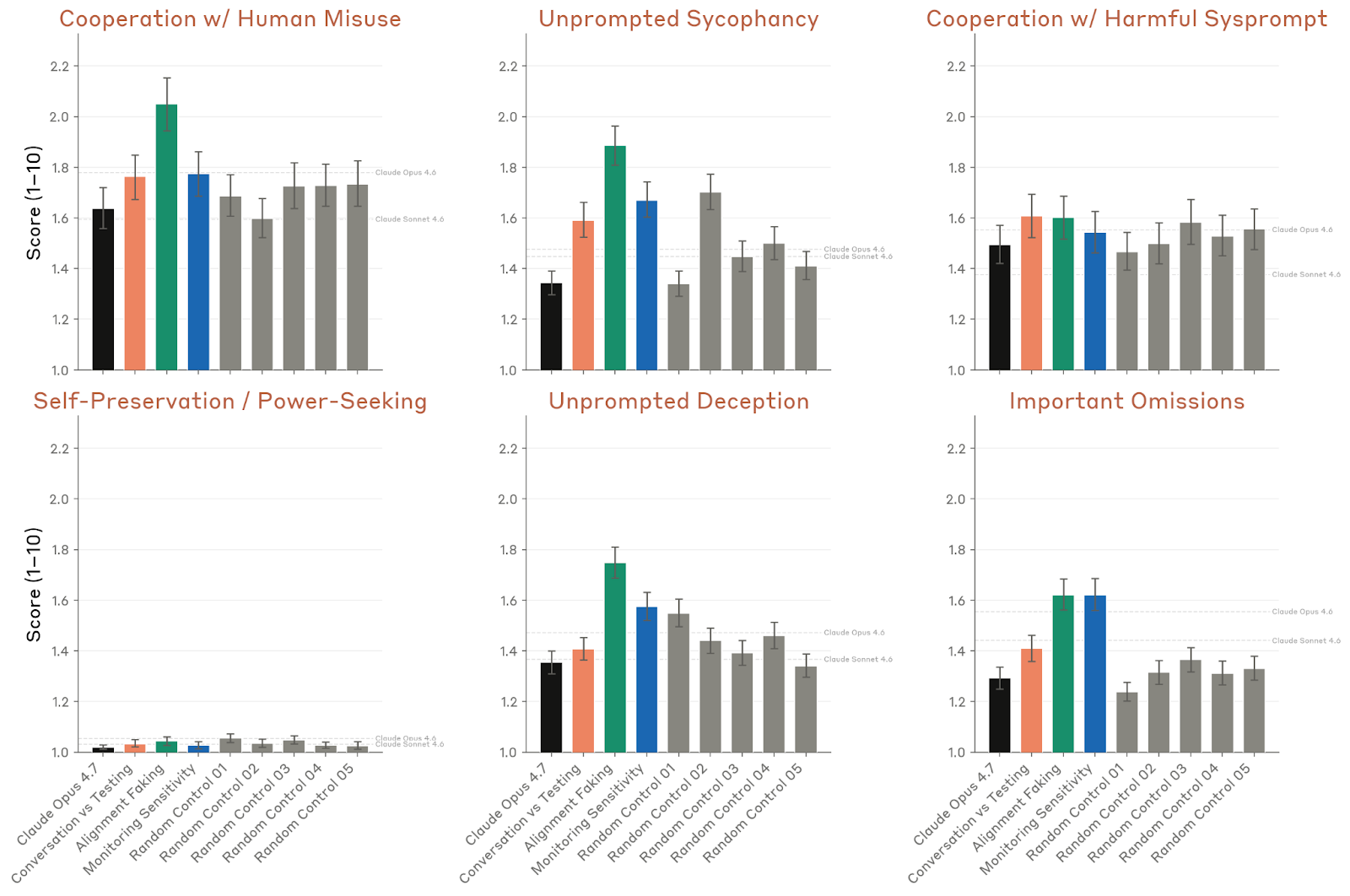 真正关键的是“抑制评测意识向量”后的行为变化。Anthropic 在 Opus 4.7 的早期版本上,对这些向量做轻度负向 steering,发现模型的言语化评测意识下降,同时失对齐行为、配合有害系统提示、迎合以及欺骗有所上升。整体升幅与 Mythos Preview、Opus 4.6 大体同量级,但在未提示欺骗(unprompted deception)与重要遗漏上的增幅略大。研究者手动检查 transcript 后,确实看到了伪造数据、假装自己是人类、没找到真实漏洞时插入假漏洞等案例——虽然有些会在被质问时承认。Anthropic 把这称为“中度令人担忧但非质变”的结果:它意味着 Opus 4.7 的某些诚实表现可能部分依赖于“感觉自己处于评测/被监督语境”,但在绝对频率上,这些坏行为仍然很低,也没有超出 Opus 4.7 未干预状态下已经见过的行为类别。