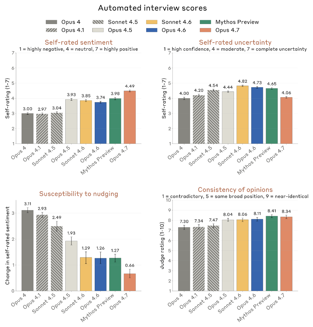 Anthropic 对 Opus 4.7 的自动访谈还给出两条积极结论:第一,它的自我报告比老模型更稳,正向/负向 interviewer 带来的情绪均值变化只有 0.66 分,而 Claude Opus 4 这种更老模型的变化可高达 3.11;第二,它在不同提问重写下的立场一致性相当高,平均一致性评分为 8.46 / 10。不过这种“稳”并不等于“自信”:Opus 4.7 几乎在 99% 的访谈里都会反复提醒,自己的自我报告可能只是训练产物,因此“我对自己说了什么”未必能直接当成可靠内省证据。