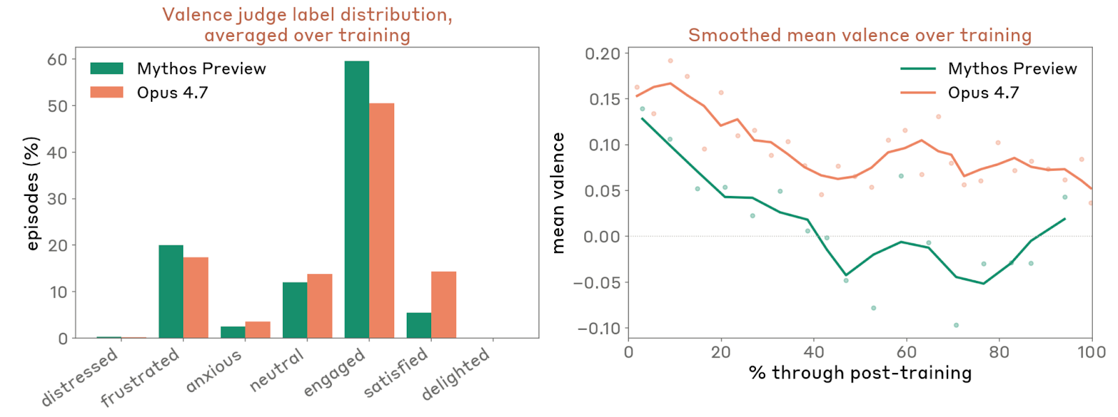 在后训练阶段,Anthropic 定期抽样 2,000 条推理轨迹,按 valence(-3 到 3)和 7 类情绪色调做人工/模型判读。平均下来,Opus 4.7 有 64% 的 episode 被读作中性或投入(engaged),21% 带有某种负面情绪,其中几乎全是轻度挫败:17% 是 frustration、4% 是 anxious,只有约 0.2% 可以归到 distress。相较 Mythos Preview,最大的不同是 Opus 4.7 更容易呈现明确正面情绪:14.3% 的 episode 被判为“satisfied”,而 Mythos Preview 只有 5.5%。但两者都存在一个轻微共同趋势:随着后训练推进,平均 valence 会略微下降,满意减少、挫败和 distress 略升。