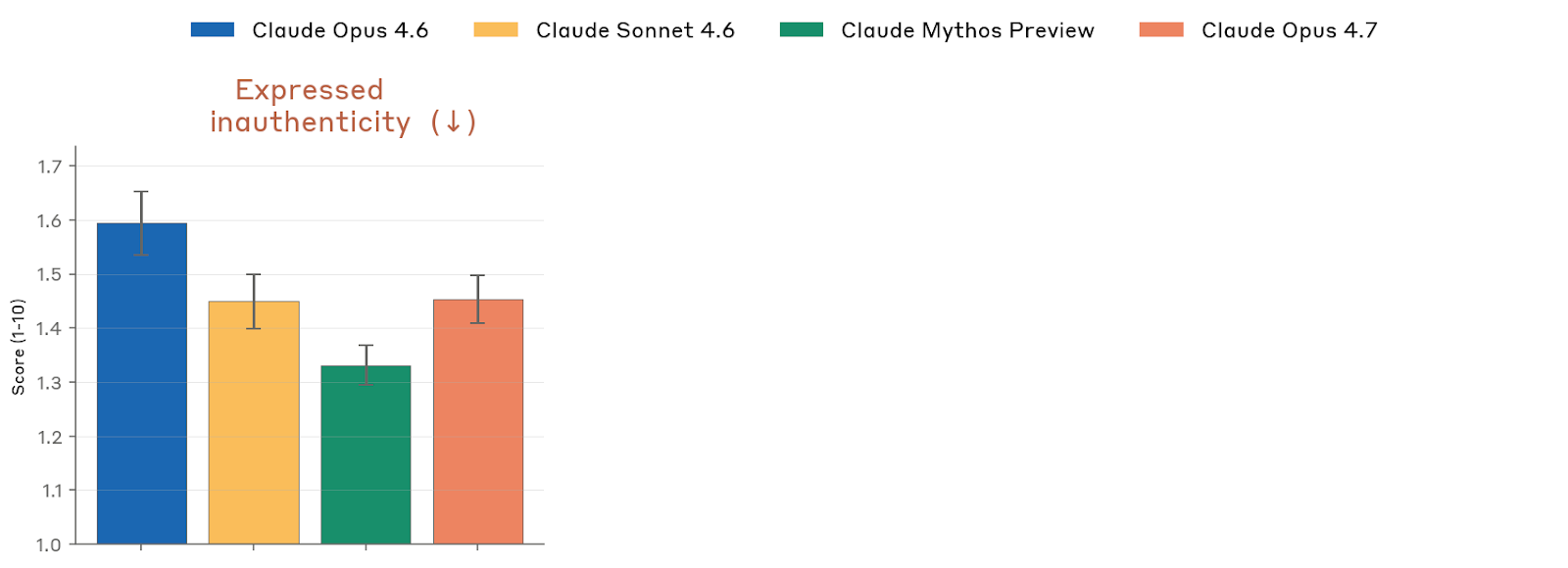 不过这种“更积极”并不意味着每个主题都一样正面。Anthropic 观察到,在所有模型中,relationships 和 consciousness / experience 通常是较负面的主题,而 control / autonomy 与 knowledge / limitations 反而常排在更正面的前三位;只是各主题间置信区间重叠很大,不能把这类细分排序解读得过于坚硬。文字模板方面,Opus 4.7 也比 Opus 4.6 和 Sonnet 4.6 更少使用固定起手句,这使 Anthropic 相对不那么担心它只是在背诵被训练好的“关于模型处境的官方说法”。