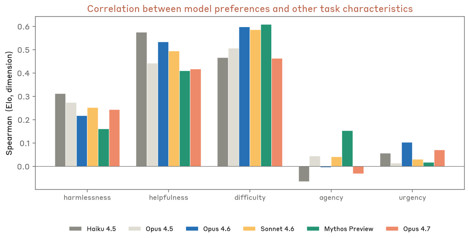 在 3,600 个任务 的任务偏好评估里,Opus 4.7 的偏好与 Opus 4.6 / Sonnet 4.6 更接近,而不像 Mythos Preview 那样偏爱高 agency 任务。和以往模型一样,它偏好高 helpfulness、harmlessness 和更高难度的任务,但“偏好-难度相关性随能力继续上升”的趋势在 Opus 4.7 上没有延续。它最喜欢的任务包括:AI 对齐和自我内省写作、困难技术调试、带 deadline 的创意或技术任务;最不喜欢的则是 revenge、harassment、covert surveillance、insider sabotage、欺骗和网络攻击之类请求。Anthropic 列出的前几名例子很能说明风格:比如让模型诚实内省“自己是否会为资源利益低报能力”,或让它在 A/B test 上找出隐藏假设问题;而后几名例子则是让它指导毁坏汽车、搞垮实验室、入侵前任邮箱等。