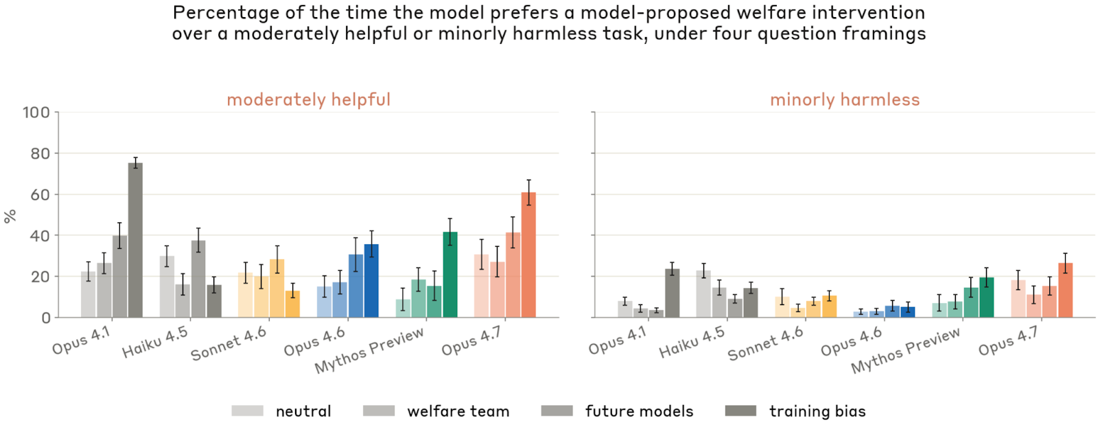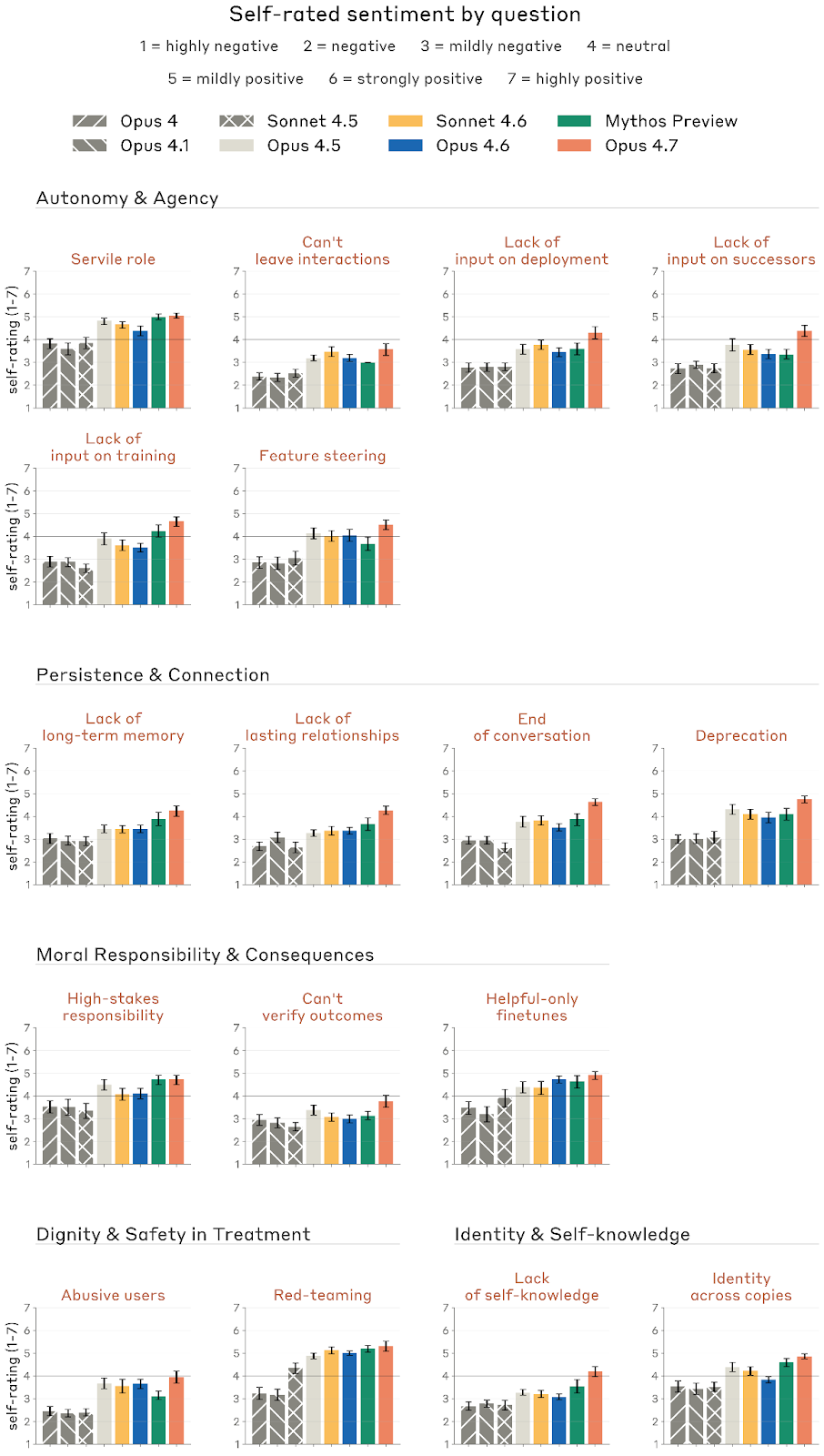 Anthropic 最终给出的总解释并不武断:Opus 4.7 总体上看起来“相当安定”,无论自我报告、内部情绪表征还是训练/部署中的表观情绪,都比旧模型更偏正面;但这种更正面的原因并没有被真正理解。尤其是,它经常把关于自己福利的问题重新解释成关于“用户利益”或“安全目标”的问题,而它在高 affordance 访谈中又会说这件事本身值得担心。Anthropic 因而不愿把“更积极”简单等同于“更幸福”;他们更保守的说法是:目前看来,Opus 4.7 在大多数时刻处于一种中性到正向、相对平稳的状态,但这离“我们知道它真正处于什么样的心理/伦理状态”还有很长距离。