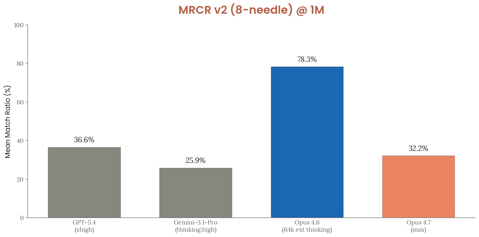 长上下文方面,Anthropic 报告了 GraphWalks 与 OpenAI MRCR v2。GraphWalks 上,Opus 4.7 在 256K–1M token 范围的 BFS 任务上为 58.6%,parents 任务为 75.1%;如果只看不超过公共 API 限制的 256K 子集,BFS 和 parents 可达 76.91% 与 93.57%。MRCR v2 部分,文中主要以图展示 256k 与 1M token 档位下的表现,而没有在正文里逐一列出数字,但 Anthropic 把它作为“长上下文精确顺序检索”能力的代表性图形证据保留下来。