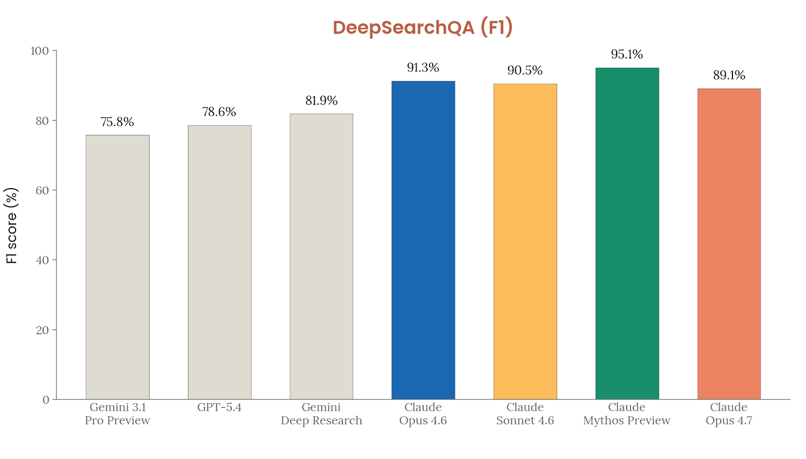 Agentic 搜索的细分基准里,Opus 4.7 呈现的是“整体强,但并非处处单调进步”的状态。BrowseComp 得分 79.3%,反而低于 Opus 4.6 的 83.7%;Anthropic 解释说,Opus 4.6 在这个基准上的 test-time compute scaling 曲线更好,但 Opus 4.7 在别的搜索基准上通常更 token-efficient,所以具体使用场景仍值得用户自行测试。DeepSearchQA 上,Opus 4.7 的 F1 为 89.1% ± 1.8%,其中 fully correct 比例为 80.7%,fully incorrect 7.0%,correct with excessive answers 3.9%。DRACO 上,Opus 4.7 得分 77.7%,相较 Opus 4.6 的优势主要集中在“分析广度与深度”以及“引用质量”,事实准确性和表达质量则变化不大。