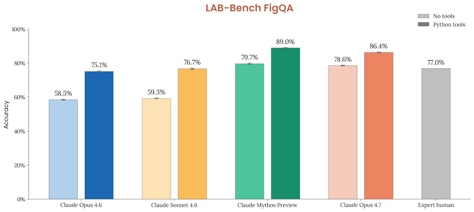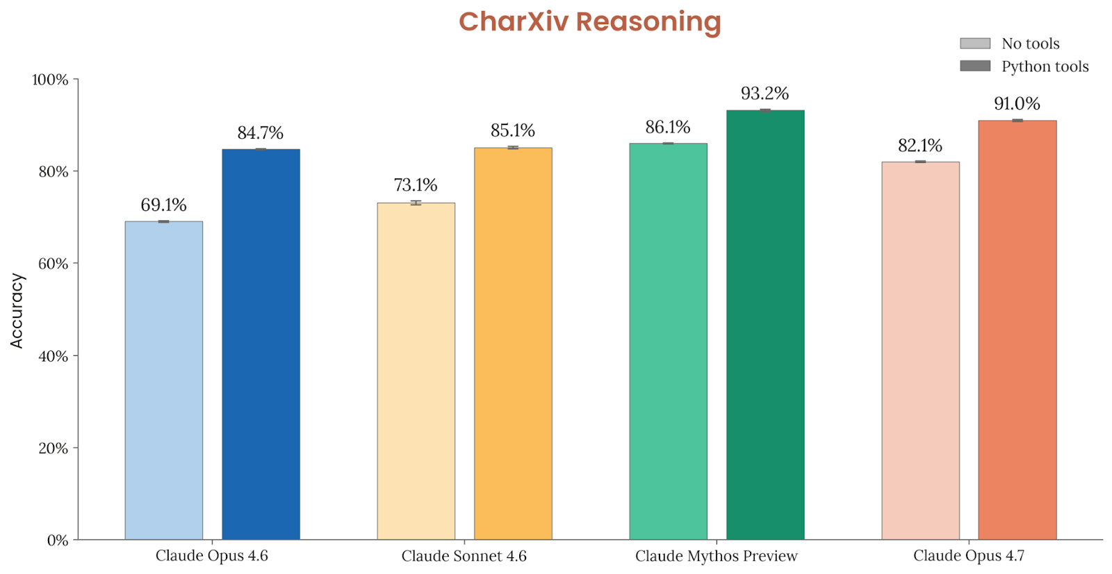 这项提升直接反映在多模态 benchmark 上。LAB-Bench FigQA 上,Opus 4.7 无工具得分 78.6%、带 Python 工具得分 86.4%,相比 Opus 4.6 的 58.5% 和 75.1% 有巨大进步;如果把 Opus 4.7 强行降回旧分辨率,它的分数会从 78.6% 下降到 74.0%,从 86.4% 降到 85.8%。CharXiv Reasoning 上,Opus 4.7 无工具 82.1%、带 Python 工具 91.0%,同样明显强于 Opus 4.6 的 69.1% / 84.7%。
