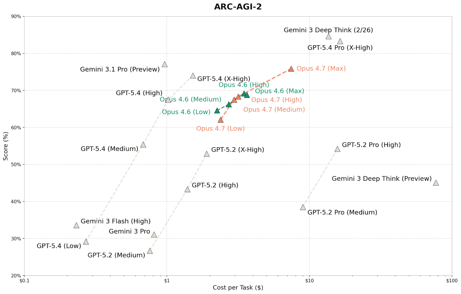 在 ARC-AGI 上,Opus 4.7 呈现出非常细的 pattern:ARC-AGI-1 在 High effort 下约为 93.5%,与 Opus 4.6 的 94.0% 基本持平,而且两者都在 High effort 时高于 Max effort,Anthropic 认为这可能是超高思考预算下 context exhaustion 的副作用;ARC-AGI-2 则达到 75.83%,成为 Opus 系列在该 benchmark 上的新高分。