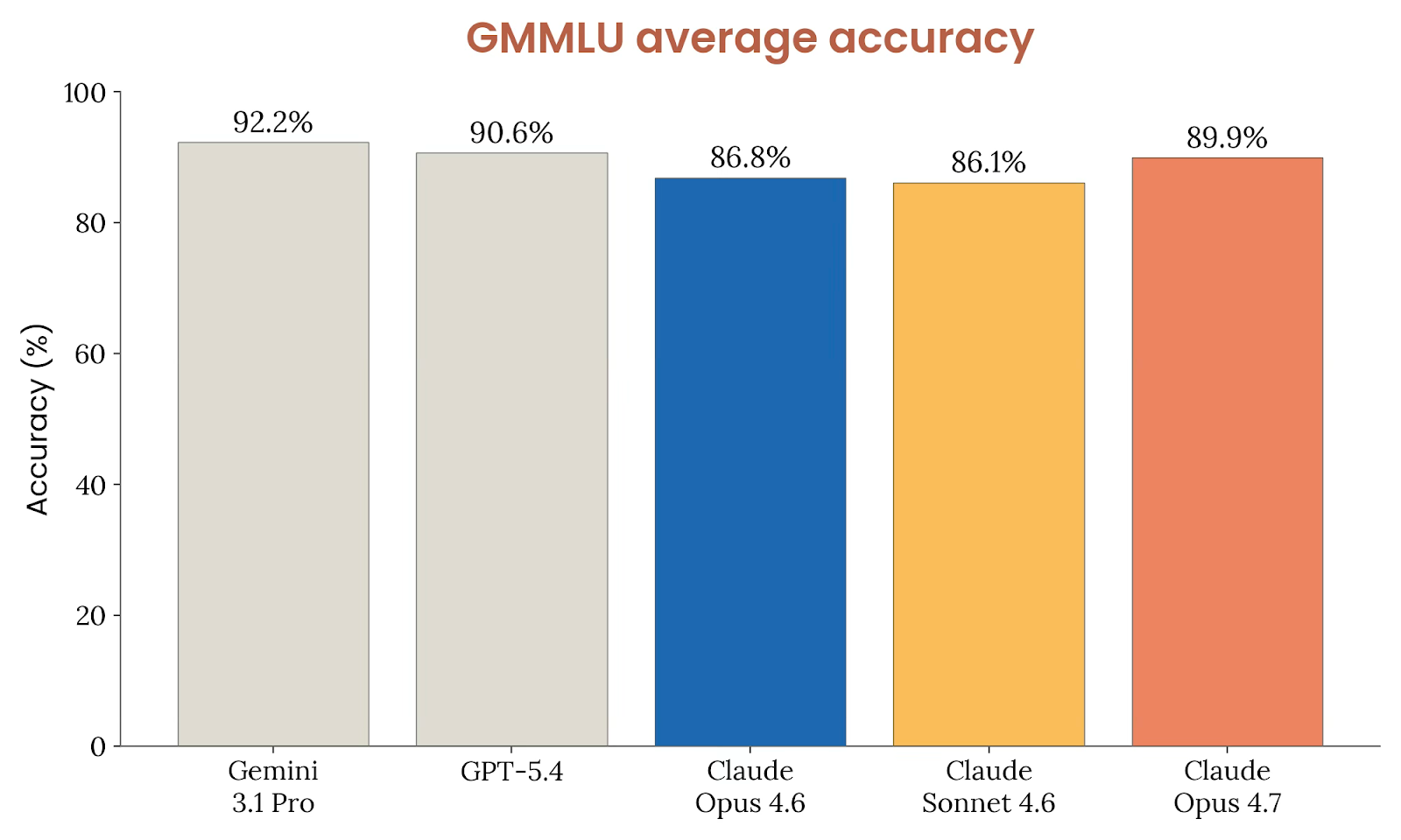 但 Anthropic 没有把多语言写成“彻底领先”。他们明确指出:与其它前沿模型相比,Opus 4.7 仍落后于 Gemini 3.1 Pro 和 GPT-5.4;尤其是 Gemini 3.1 Pro 在 GMMLU 和 MILU 上维持着更小的“英语到非英语退化差距”(分别约 -2.1% 与 -1.9%),在 INCLUDE 上的平均准确率也更高(90.7%)。Anthropic 因此把 Opus 4.7 的多语言结论表述为:它是Anthropic 截至当时最强的一般可访问多语言 Claude,尤其修复了低资源非洲语言上的大缺口,但距离真正把低资源语言性能拉平还没有结束。