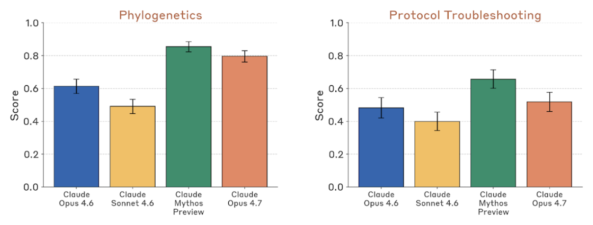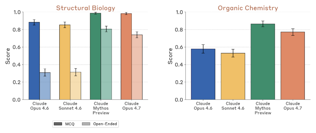 具体来说:BioPipelineBench Verified 为 83.6%,高于 Opus 4.6 的 78.8% 和 Sonnet 4.6 的 73.5%,低于 Mythos Preview 的 88.1%;BioMysteryBench Verified 为 78.9%,Hard 子集为 20.9%,后者与 Opus 4.6 的 23.5% 大致在噪声范围内,说明“人类尚未解决的困难分析题”依然很难。结构生物学上,选择题版本达到 98.3%,开放问答版本达到 74.0%,后者比 Opus 4.6 的 30.9% 翻倍有余。有机化学为 77.2%,相较 Opus 4.6 的 57.9% 是一次大跃升;系统发育学为 79.6%,显著高于 Opus 4.6 的 61.3%;实验 protocol troubleshooting 为 51.8%,也高于 Opus 4.6 的 48.3%,只是离 Mythos Preview 的 65.7% 仍有明显距离。